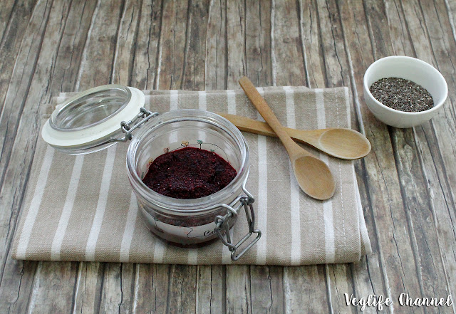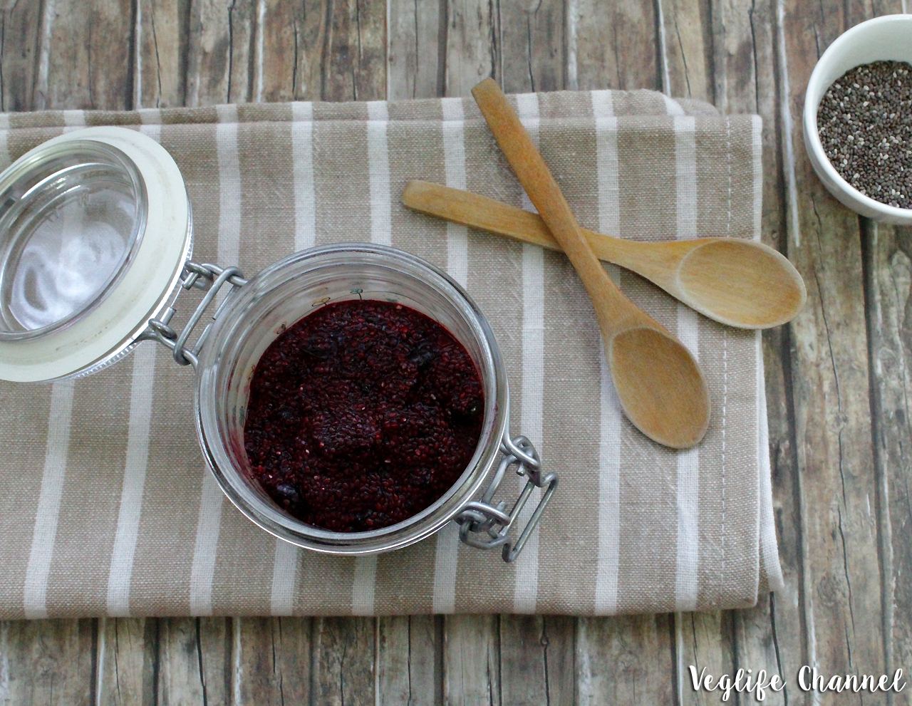 Facciamo raffreddare con il tappo socchiuso, quindi riponiamo il barattolo in frigo per almeno 8 ore in modo che i semi si espandano e la confettura si addensi.
