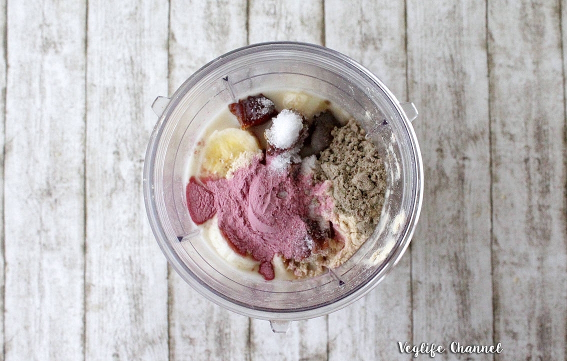 Sbucciamo la banana e tagliamola a rondelle, inseriamo tutti gli ingredienti all’interno di un frullatore e frulliamo fino ad ottenere una crema liscia.